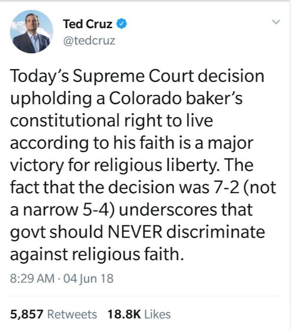 得克萨斯州参议员Ted Cruz的推文则是盛赞高院决定,说政府永远不该干涉民众的宗教信仰。