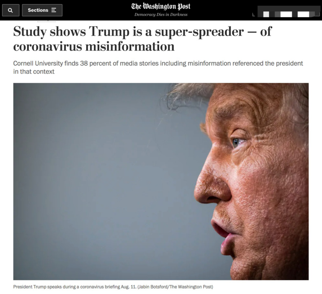 《华盛顿邮报》报道康奈尔大学一项研究结果:川普是世界上最大的冠状病毒错误信息推动者