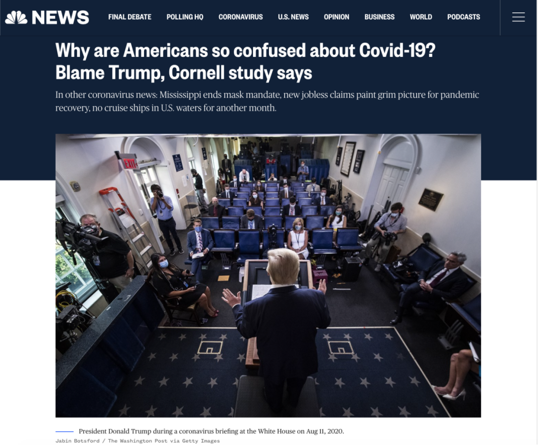 NBC电台报道报道康奈尔大学一项研究结果:川普是世界上最大的冠状病毒错误信息推动者。