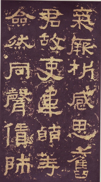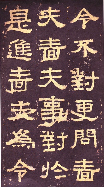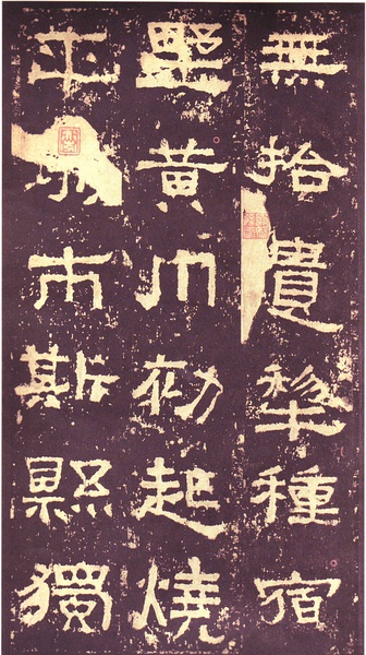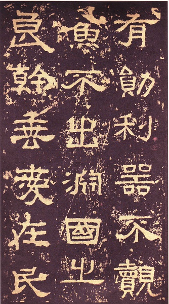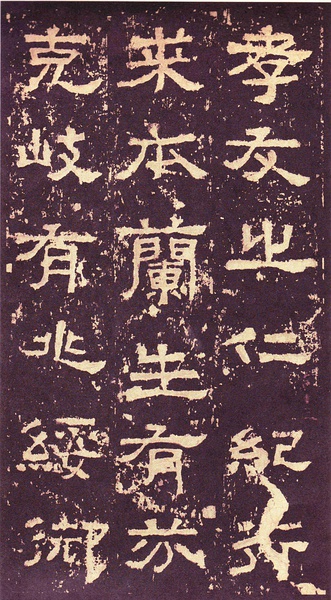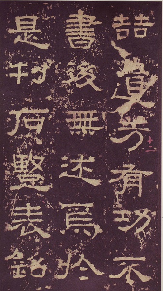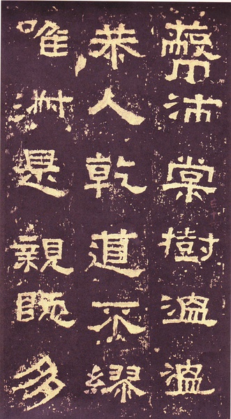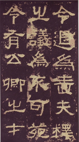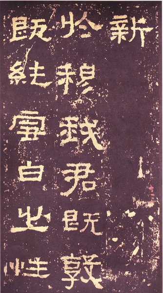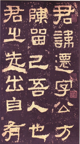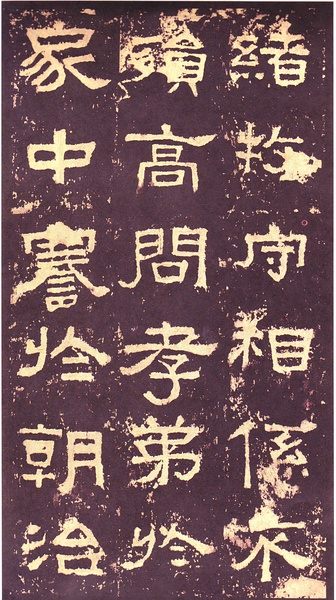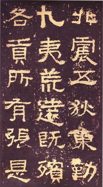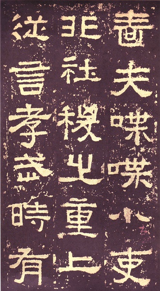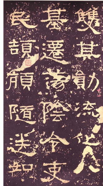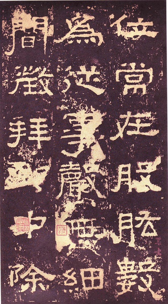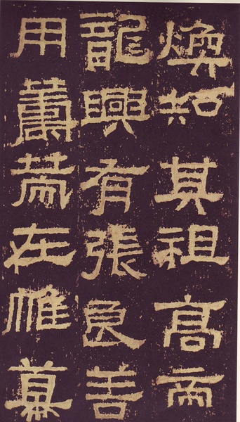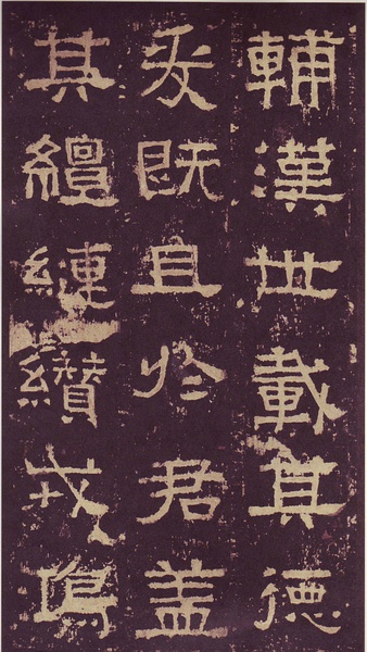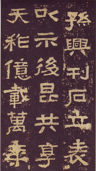 此碑书体多为“方笔”, 棱角分明,结构严整,笔法凝练,呈现古茂朴厚,方劲雄浑的风格。笔道粗细介于二分笔与三分笔之间。波画的提按过渡不甚明显,有别于孔庙三碑的大撇重捺。字形偏于古拙一路,虽字迹多漫漶,然端整雅练,剥落之痕亦复天然,结字运笔已开魏晋风气。《张迁碑》上承西周《盂鼎》书风,四周平满,严正朴茂,而且接近楷法,开启北魏《张猛龙碑》、《龙门二十品》一路书法。