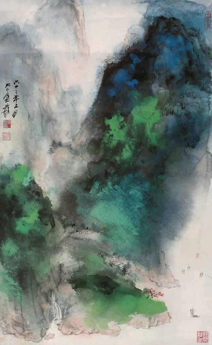 张大千的画风,先后曾经数度改变,30岁以前的画风可谓“清新俊逸”,50岁进于“瑰丽雄奇”,晚年时历经探索,在57岁时自创泼彩画法,是在继承唐代王洽的泼墨画法的基础上,揉入西欧绘画的色光关系,而发展出来的一种山水画笔墨技法。可贵之处,是技法的变化始终能保持中国画的传统特色,创造出一种半抽象墨彩交辉的意境。