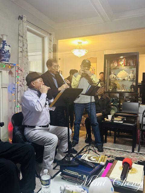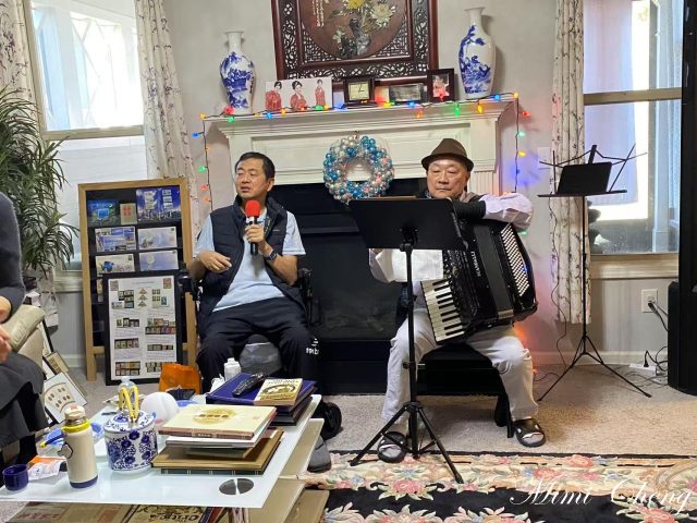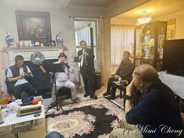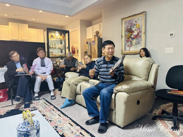 笔会前会长王晓衡先生带来了音响设备,组织大家即兴演奏和载歌载舞。桌上是各色甜点、水果与小吃:明明的蟹肉饼、孝椿的蛋糕,