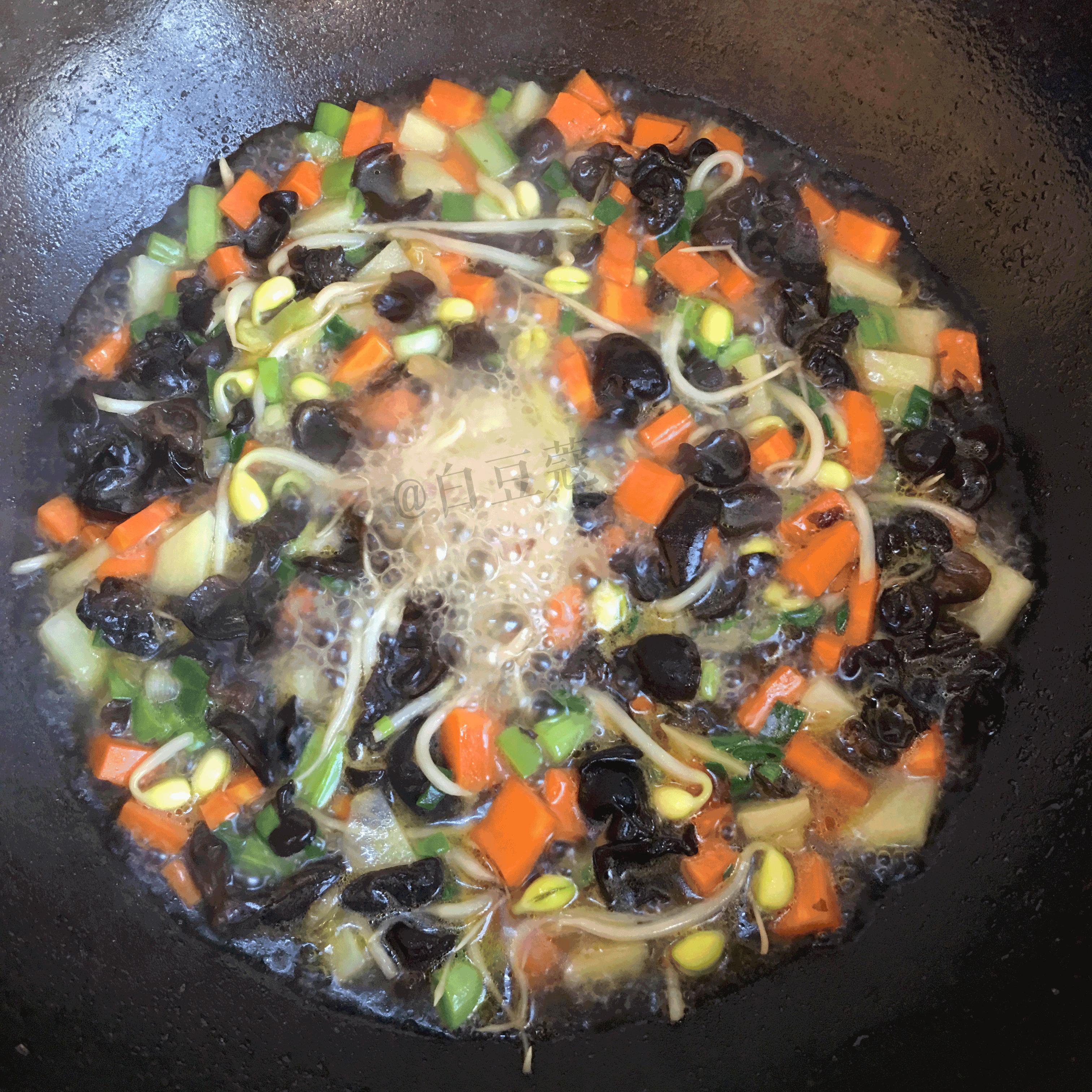 素臊子我的用土豆、胡萝卜、木耳、黄豆芽。 其他如香菇、韭菜、绿豆芽、洋葱、豆角,老豆腐,豆干等任意你喜欢的菜都行。