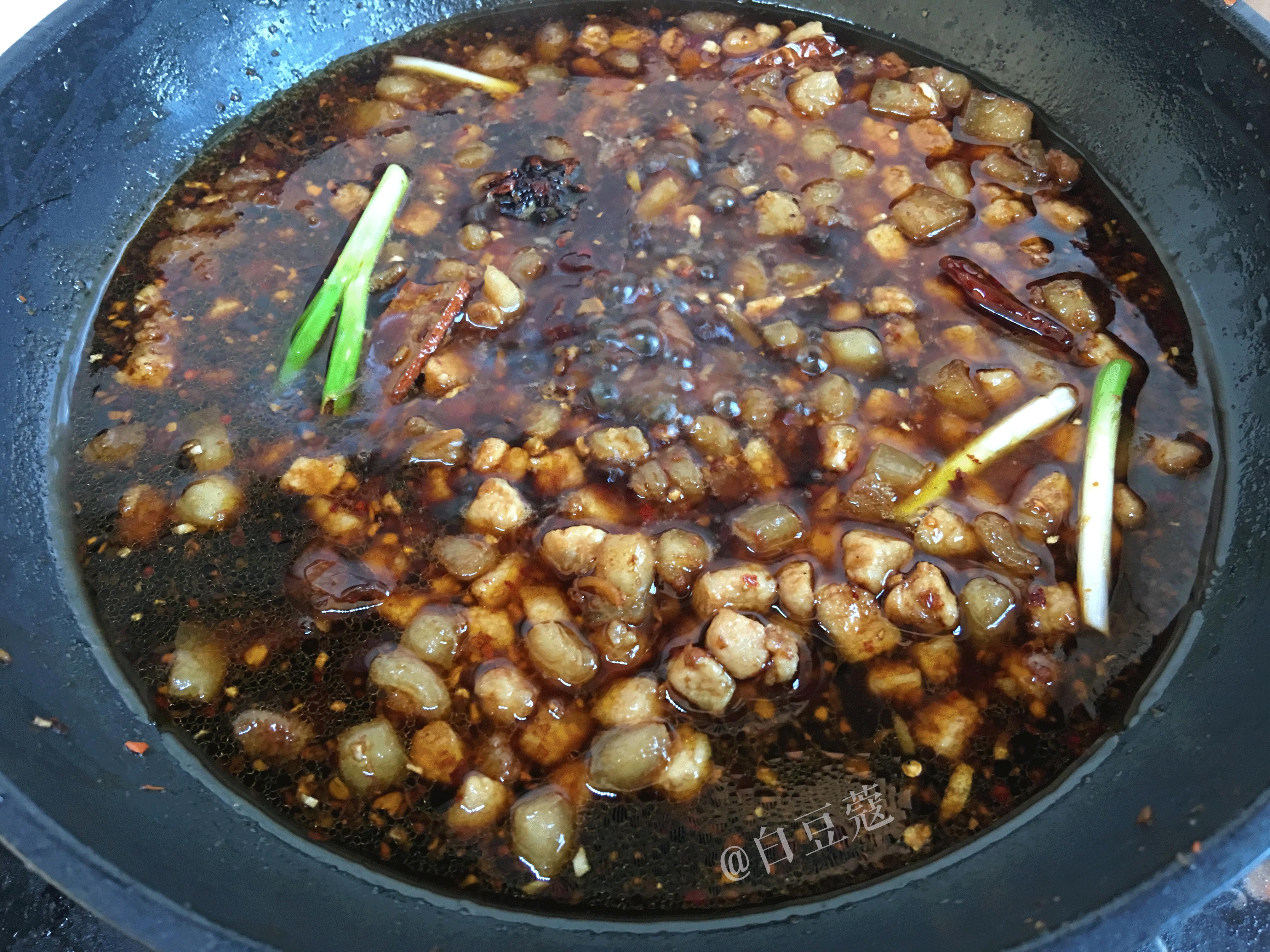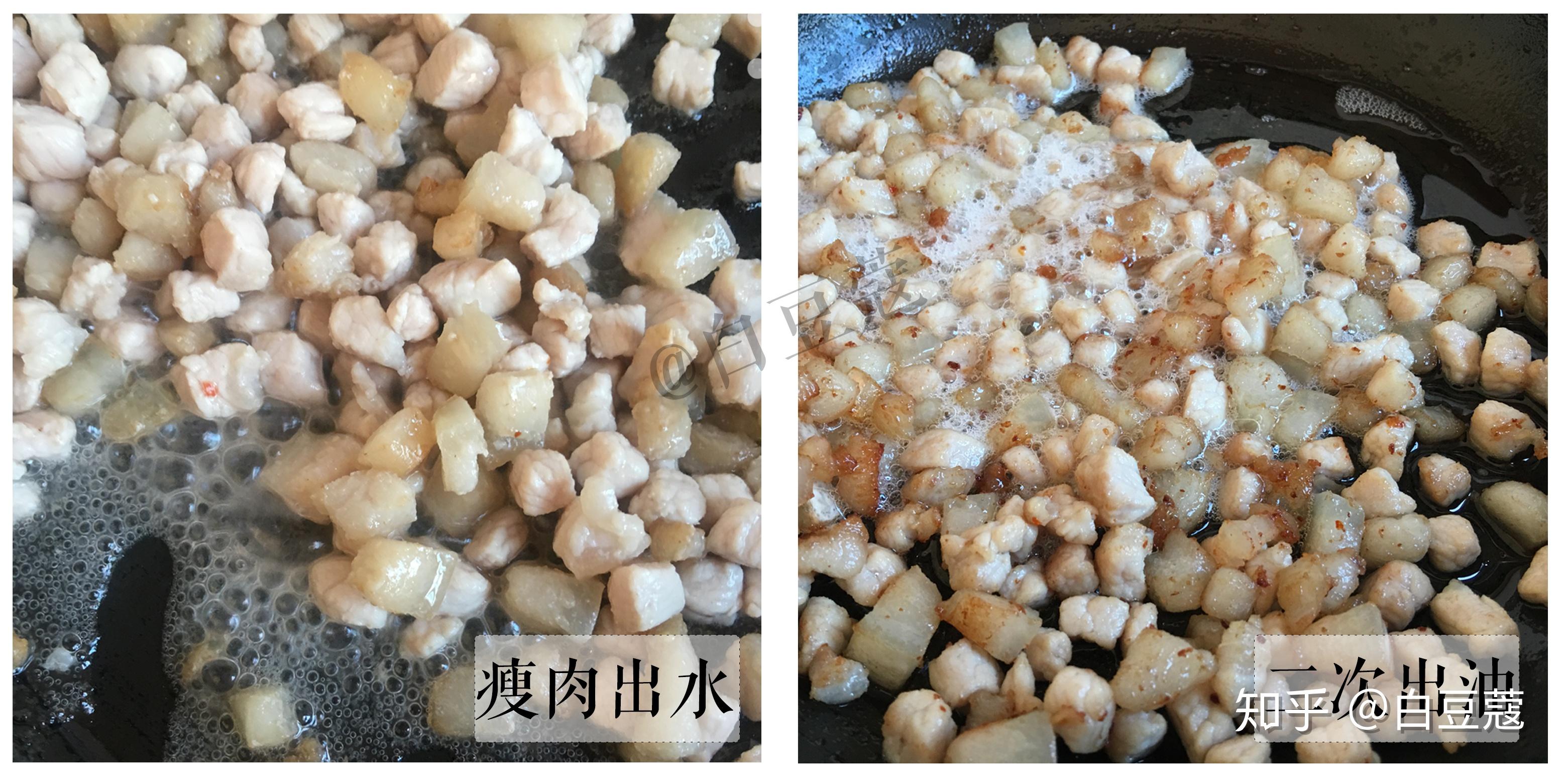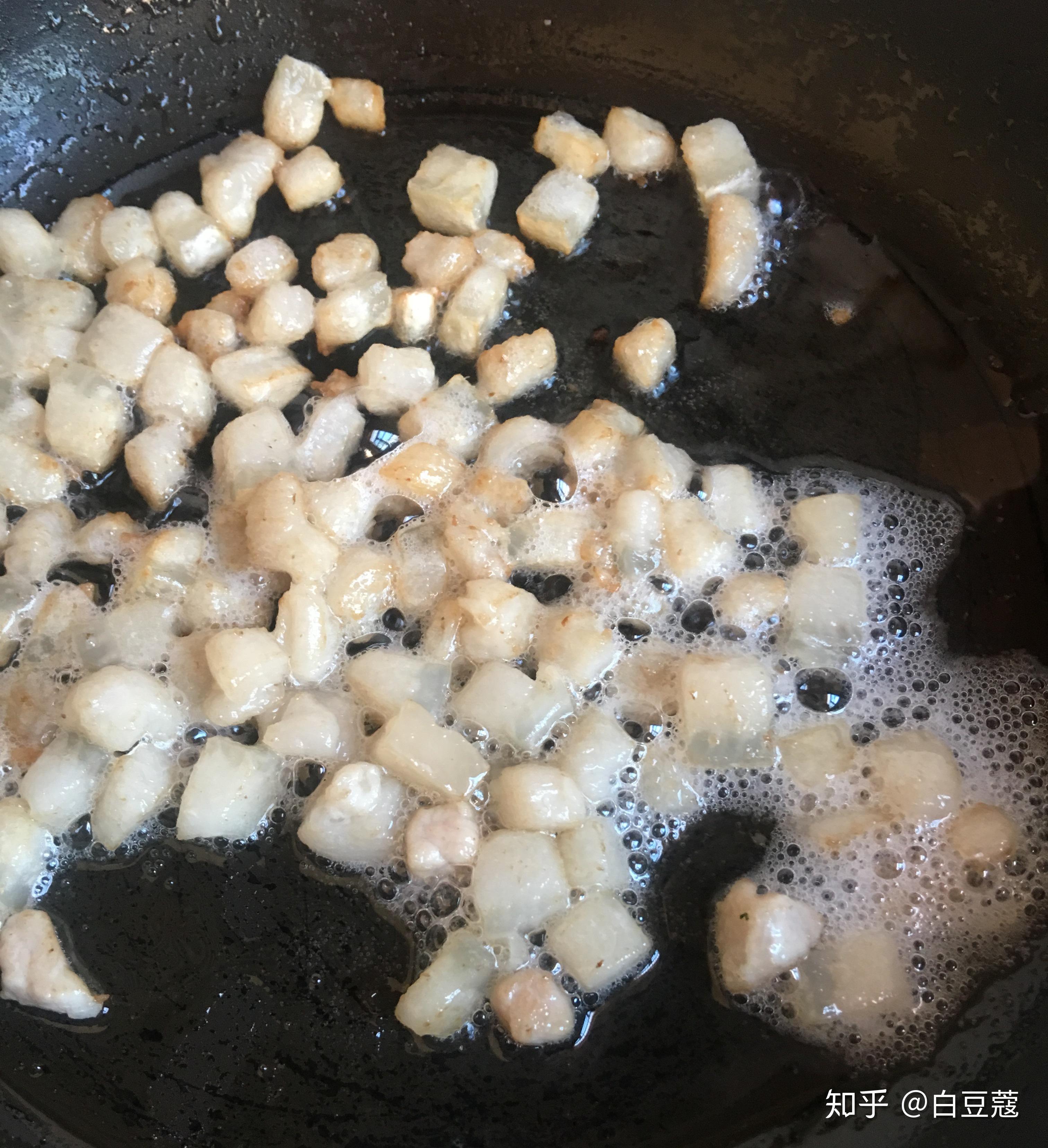 只有先把肥肉里面的水汽全煸出来,肉才不会腥气,一直翻炒到肥肉开始慢慢的吐出油脂。