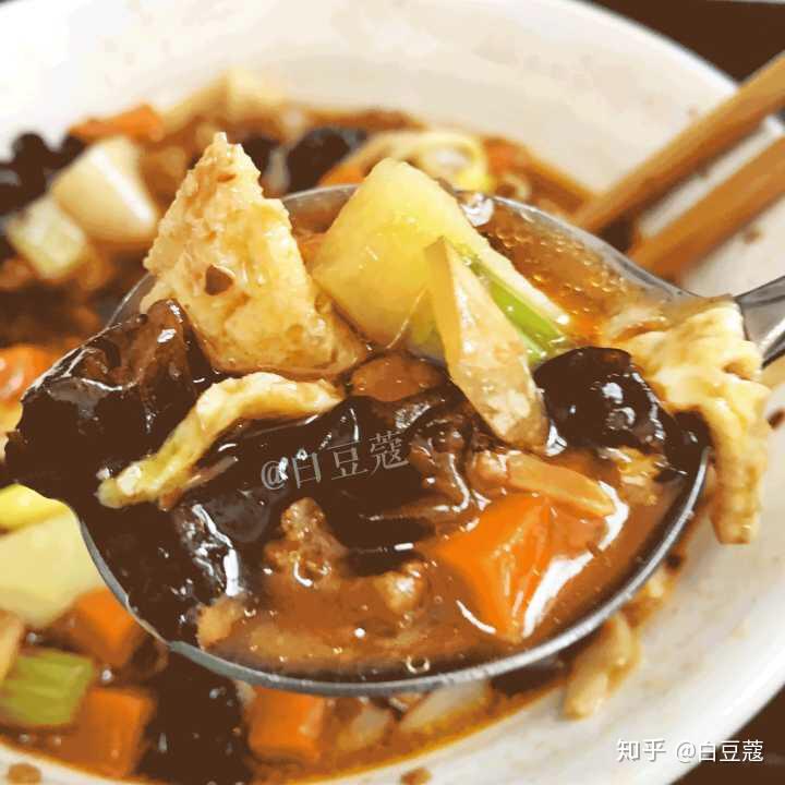 2勺素臊子、2勺肉臊子、2勺酸汤,撒上几片蛋皮