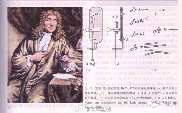 (列文虎克,1632~1723,职业:门卫,荷兰人,制成了世界上最早的可放大近300倍的金属显微镜,1673年将自己的观察记录发给了英国皇家学会,现代医学从此拉开了微生物学研究序幕)