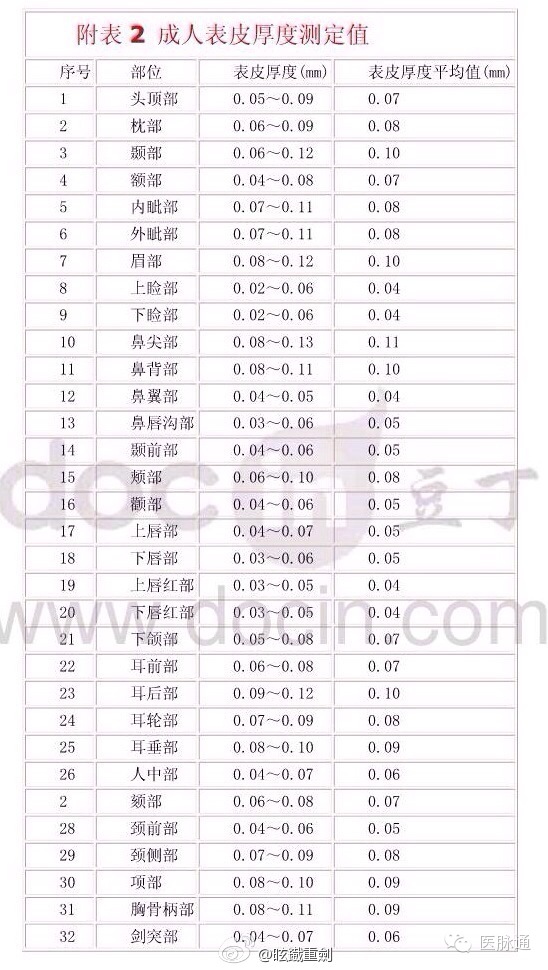 上图可见,我们的表皮很薄,平均厚度约0.1毫米,面颊部的表皮厚度平均更是只有0.05-0.08毫米,这还是成人标准,幼童的通常比成人更薄。而掌跖这些地方的表皮厚度则几乎是面颊的一倍以上。所以,面部的很浅的创面都可以导致留疤,而手脚那些表皮较厚的区域则相对不容易留疤。