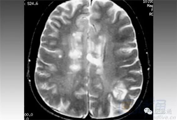 多 发性硬化或MS,是中枢神经系统炎性脱髓鞘疾病。疤痕组织不断沉积所形成的硬化斑块导致渐进性的肢体功能障碍。尽管MS的病因不明,一些研究者相信自身免 疫过程可能是其病因,遗传、感染和免疫因素可能与其相关。可加剧或缓解的药物及治疗方式尚未确定。磁共振成像(MRI)T2相显示许多高信号区域,其预示 存在广泛性病变。