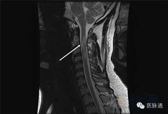 MRI对于评估脑干或脊髓病变也非常好。此处图像所示MS斑块在颈髓(箭头)。计算机断层扫描(CT)和超声对于MS的诊断作用非常有限。