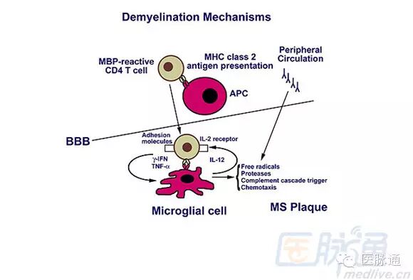 虽 然脱髓鞘的确切机制不明确,一种可能的机制是由抗原呈递细胞活化外周髓磷脂-特异性T细胞。T细胞通过粘附分子的表达穿过血脑屏障,并能分泌促炎因子(γ 干扰素和肿瘤坏死因子),其可导致静脉周围组织的损伤。据推测额外抗原的暴露可能导致抗原表位的扩散和其它炎细胞的募集。活化小胶质细胞所释放的自由基、 一氧化氮和蛋白酶也可导致组织损伤。