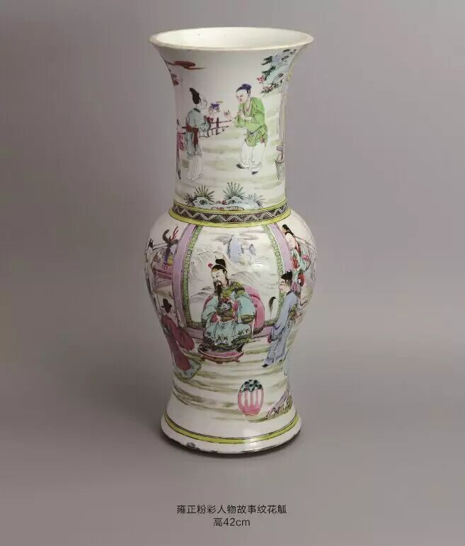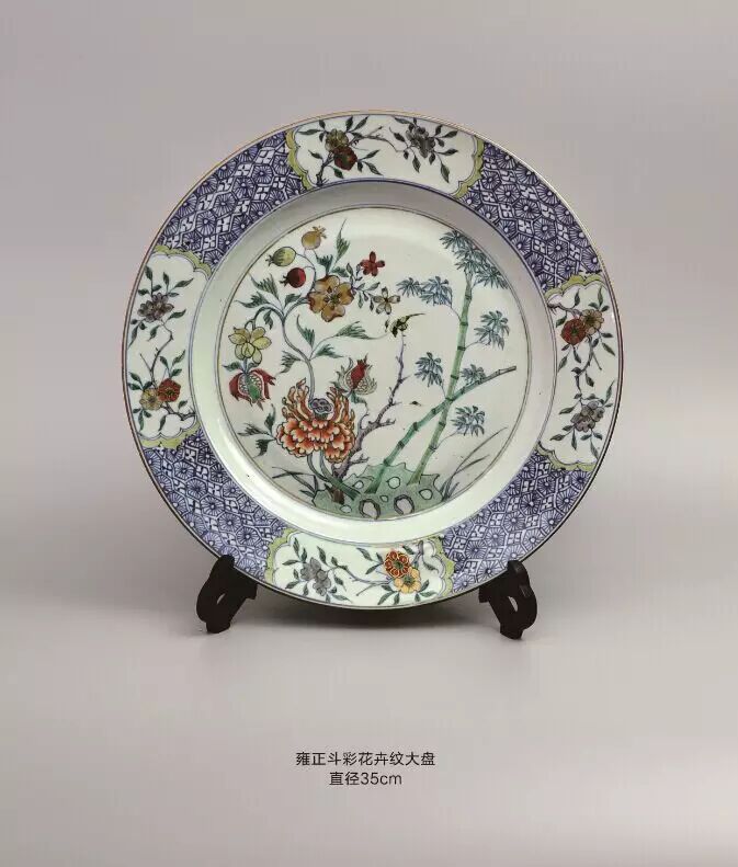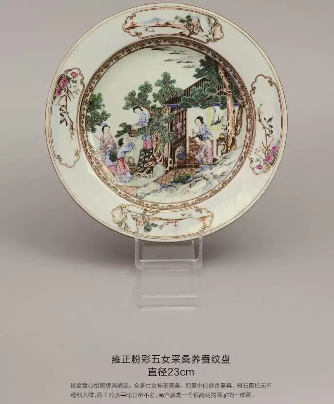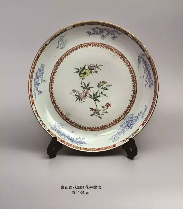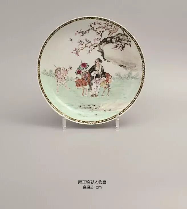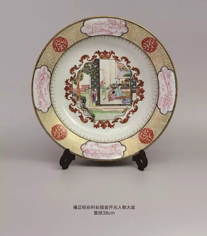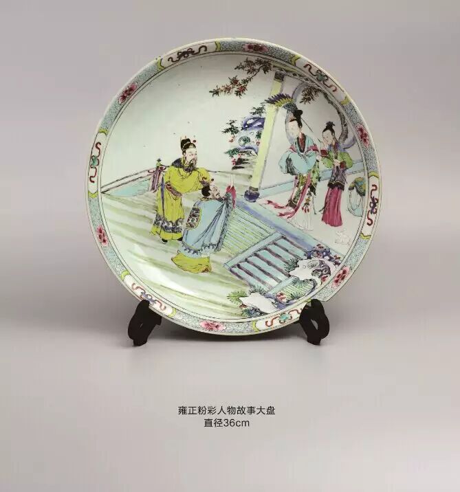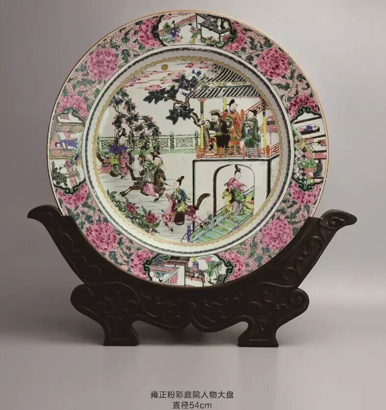 该盘壁绘缠枝牡丹,四开光内绘西厢记人物故事:盘底绘庭院,雕栏围界,古松瀑萌,奇花散香,右侧绘挑角重檐二层楼台,上层立三位冠服官人,分着褐红绿袍服,俯视庭院四位骑手策马表演。此盘不仅绘制精妙,在情节把握与细节表现上也极具匠心。可谓经典。此盘硕大,烧造难度大,绘画精美,纹饰稀少极具收藏价值。跑马艺术为为中国传统杂技表演形式,多见于文字记载,而少见于图象记载。此盘绘制的图画,再现了雍正年间达官贵人的生活场景.有很高的历史价值。