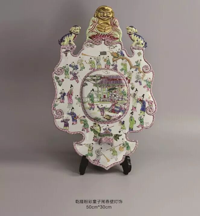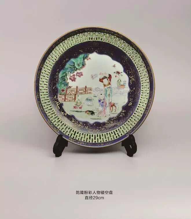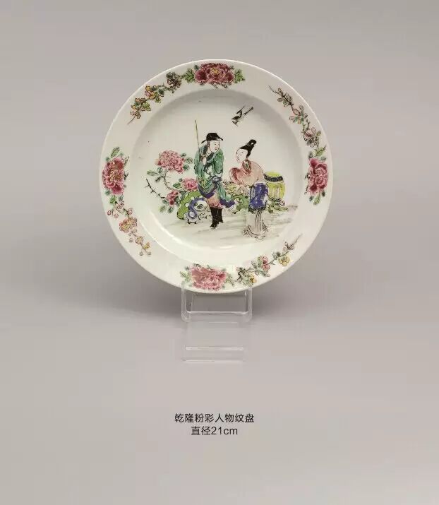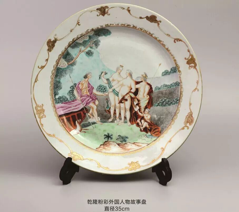 该盘饰以墨彩、金彩和凡红绘成的图案,描绘一对欧藉夫妇.背景为山水树术,左方有河流和船只,男子正将酒倾注于女子手持的贝壳,女子另一手持手杖,腰带牌匾上饰有人首纹,前方为一有翼小神仙,手持木捧及火炬。这纹饰是摹自一幅在1708年出版,由班纳、费卡创作的蚀刻画,题目为【茜菲娜岛的参拜者】茜菲娜是个希惜小岛,在古典传说中是爱神维纳斯的出生地因此这纹饰含有爱情的意味,爱神向这对情侣指示.船只会将他们带到茜菲娜岛上,1923年德、佛里斯首先指出这纹饰是仿自费卡的版画,其后不少人士亦多次刊载这幅版画,从而使该纹饰的瓷器价格上涨.成为出口瓷中的珍品,目前市场价格在3000欧元一只左右,这对盘于是比利时收藏家割让给我的。在他家中存放了近三十年。