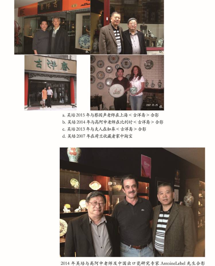 2005年七月吴培先生的第一家“古洋斋”落户上海中福古玩城,2006年在江苏如皋创立“古洋斋”连锁店,并任如皋市收藏协会名誉主席。2010年在比利时成立“多宝堂”海外分公司。历经十余年的苦心经营,吴培先生以人品与货品在收藏界为人称道,2008年部分出口瓷藏品为北京资深藏家胡雁溪老师收购,成功在首都博物馆举办首届外销瓷展览。2012年在比利时和好友创立了中比人文交流协会,任常务副会长。