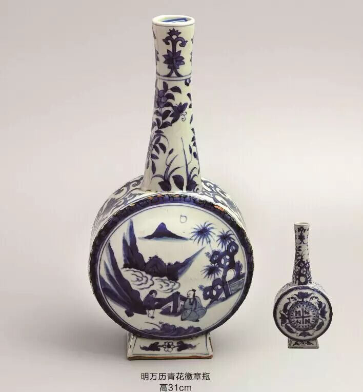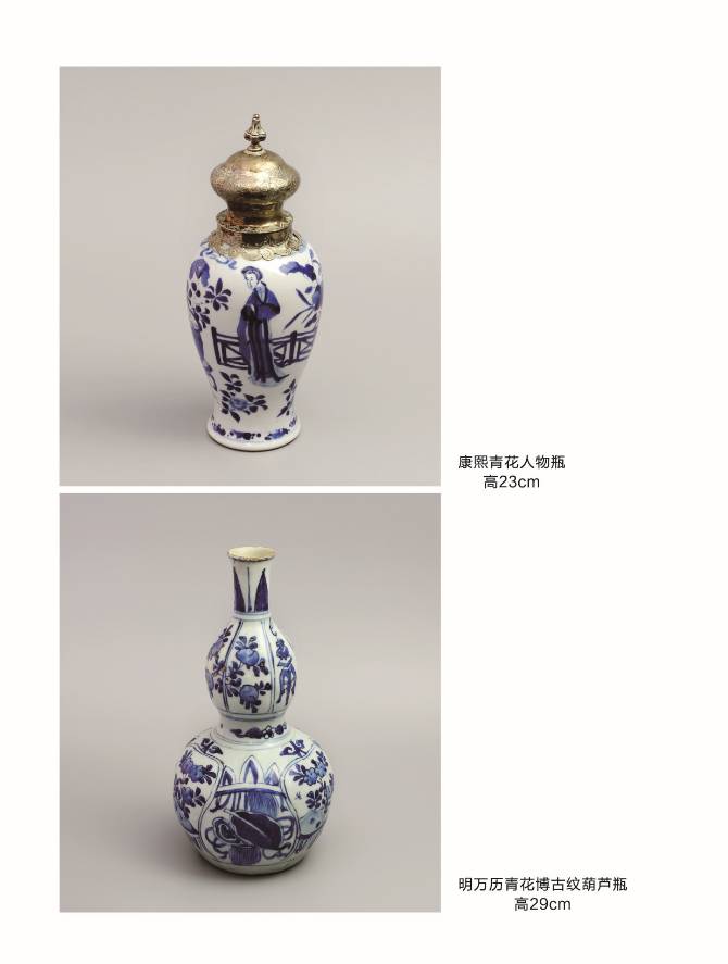 这种瓶子被称为圣水瓶.与西班牙国王菲力二世相关,他在1580到1598年之间统治葡萄牙。在1598-1621年他继位西班牙国王,在1598-1621年间他命人到景德镇订烧了这种纹童的圣水瓶,他统治朋间属于万历至天启初年,一般地认为天启年前后订烧的可能性较大。类似的圣水瓶还陈列于:葡萄牙国家艺求博物馆,阿纳斯塔休博物馆,东方基金会,卡布瑞博士收藏及其他一位私人收藏中。几乎相同的瓷器还出现在大英博物馆,伦敦维多利亚阿尔伯特博物馆,爱尔兰都柏林现代艺术馆私人展厅,美国塞伦—波士顿博物馆,东京国家博物馆。这些长颈瓶在同一位置都有皇家标志,但是扁圆瓶身的另一面是花草图案而不是人物图案。