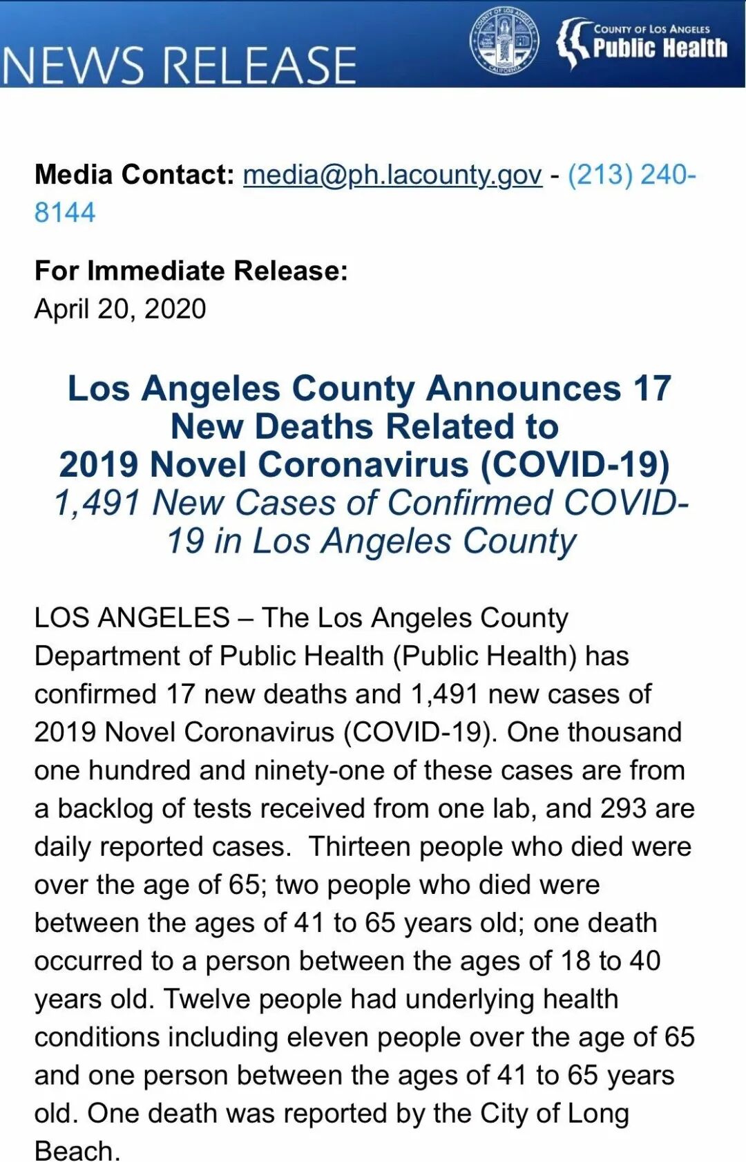 4月20日,洛杉矶郡刚刚宣布今日已确认17个新增新冠死亡案例和1491例新确诊病例。新确诊案例中有1119个来自一个实验室累计的测试案例,另外的293个是每日报告的新案例。年龄超过65岁死亡人数是13人;2名死亡者年龄在41至65岁之间;1名死亡人士年龄在18至40岁之间。有12个人患有基本的健康状况,其中包括11名65岁以上的人和1名41至65岁的人。长滩市报告有1人死亡。