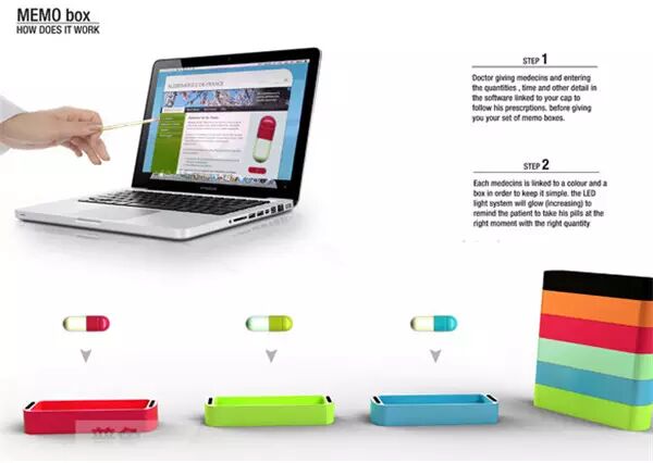Memo是为那些患有老年痴呆症的病人设计的它能用灯光的颜色来提醒病人服用对应颜色方块里面的药丸。