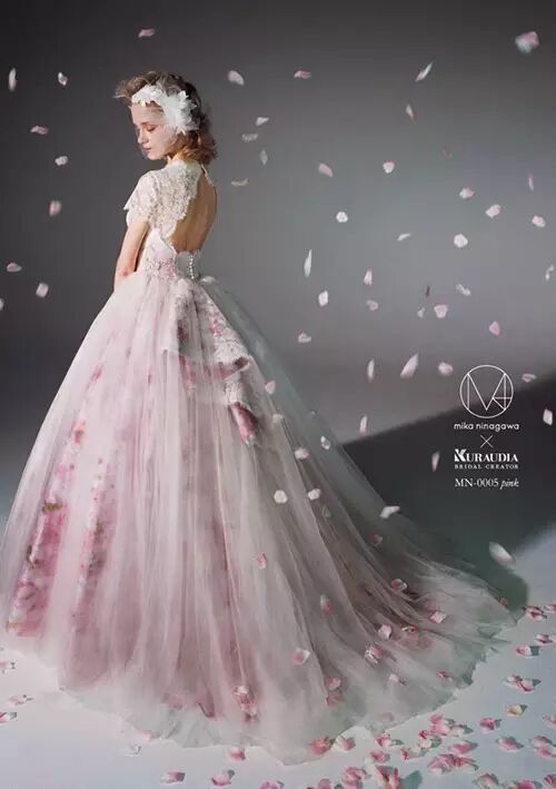 婚纱使用了大量的印花、蕾丝、薄纱,在头饰的部分并没有做夸张夺目的设计,礼服如此绚烂早已吸引不知多少双女士们的眼球,粉嫩从天而降的花瓣也配合著每套礼服的颜色做点缀,花瓣的飘落揉捻了女性对梦幻婚礼的向往,展现了强烈的蜷川风格!