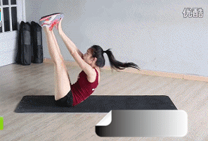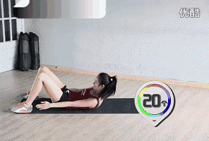 2、双腿并拢抱住头部,拱起腿做仰卧起坐,反复20个。