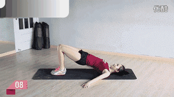3、平躺在瑜伽垫,拱起双腿,微微抬起身体,双臂交替摸左侧脚踝和右侧脚踝,重复20个。