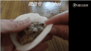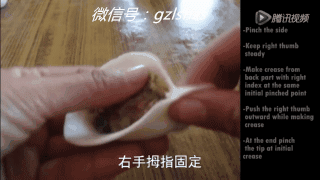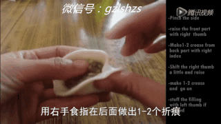 用右手大拇指支撑前面,右手食指在后面做出1-2个折痕,以此类推,再用左手将馅塞进去。