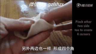 将四面的皮捏到中间,一个四角的饺子就形成了!