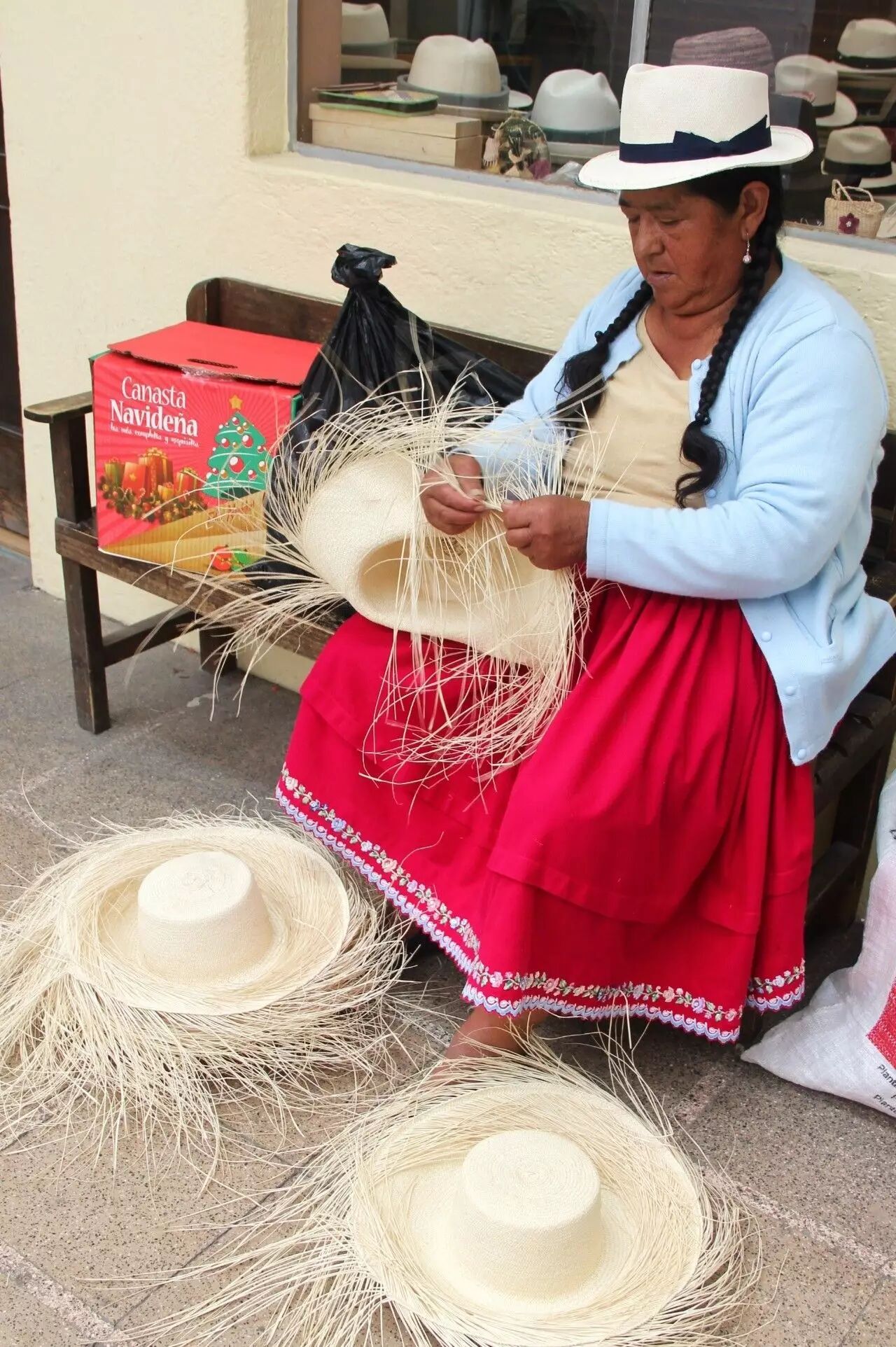 在厄瓜多尔昆卡老城,身着传统服饰的印第安妇女编织草帽。 (新华社记者梁君茜摄)