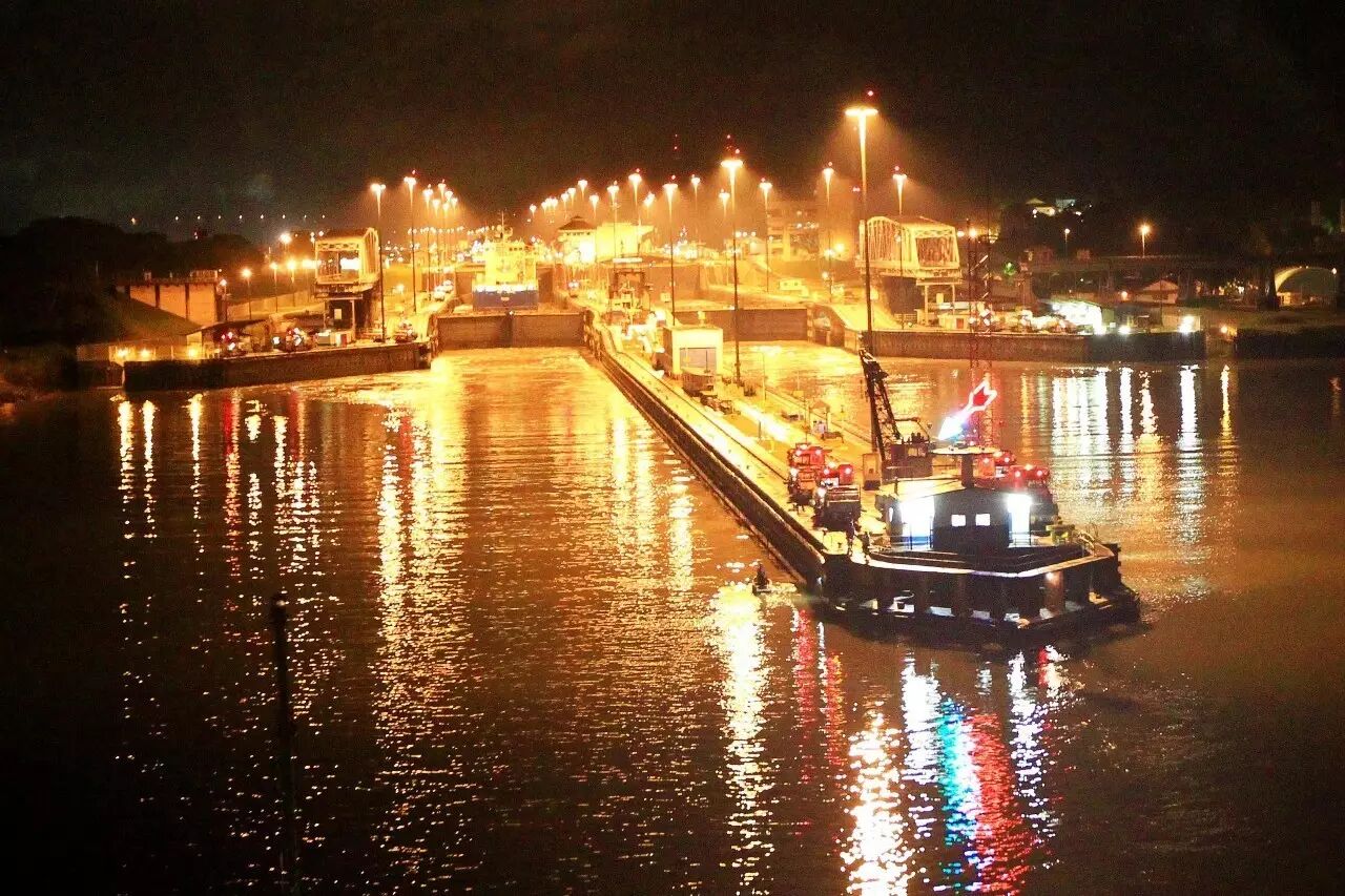 2011年10月16日,中国海军“和平方舟”号医院船通过巴拿马运河船闸。 (新华社记者查春明摄)