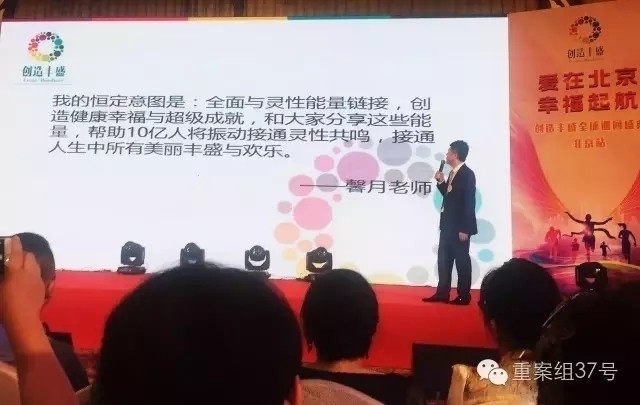 六月初“创造丰盛”北京盛典现场,主持人给大家讲解“馨月老师”的心灵鸡汤。