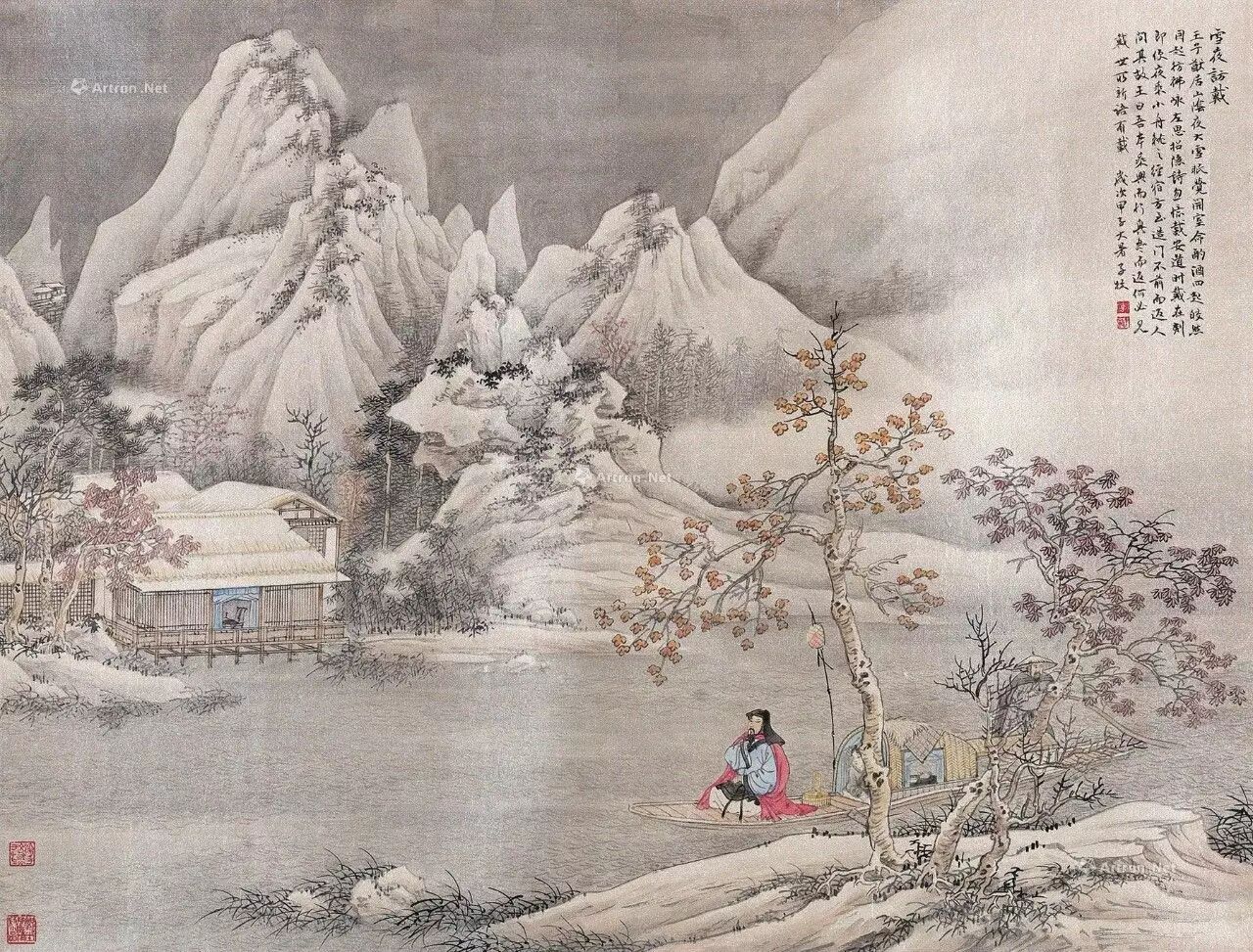 《世说新语·任诞》:王子猷居山阴,夜大雪,眠觉,开室命酌酒。四望皎然,因起彷徨,咏左思《招隐诗》,忽忆戴安道。时戴在剡,即便夜乘小船就之。经宿方至,造门不前而返。人问其故,王曰:“吾本乘兴而行,兴尽而返,何必见戴?”王徽之雪夜起兴,驾舟访戴逵,天亮到了戴家门口,又因兴尽而返回。发生在雪夜的友情,也是如此的雅致、率真和不染尘埃。