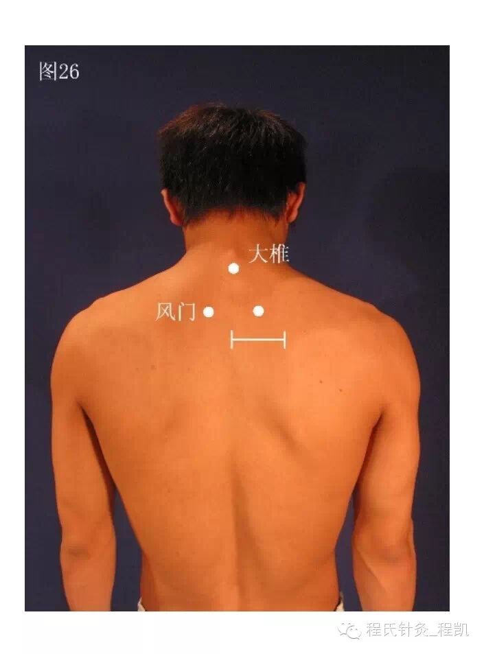 从大椎向下数第二个突起的高骨下,至肩胛骨内侧边缘的中点处,即为风门穴。被治者取坐位或俯卧位,施治者双手同时用力点按两侧风门穴,亦可用手掌小鱼际垂直上下搓热本穴,以穴位局部皮肤发红为度。