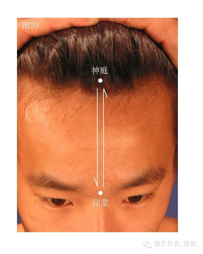 被 治者取坐位或仰卧位,施治者站其头后,将双手拇指微微立起,用拇指的指腹,自被治者面部正中两眉之间印堂穴起,交替按揉至前发际边缘处的神庭穴,按揉时用 力要柔和,要先稍用力按下再轻轻揉动,以被治者感觉点按局部有轻微酸胀感为度,从印堂至神庭,再从神庭至印堂,反复按揉,至少十分钟,能缓慢入睡为佳。