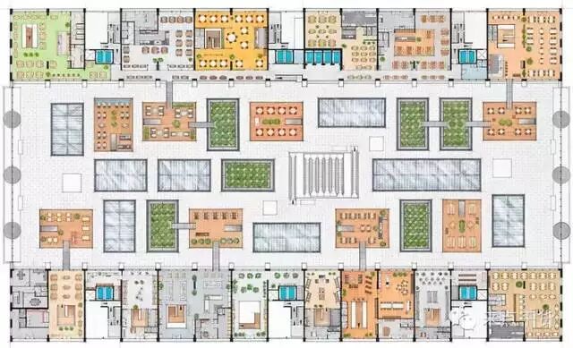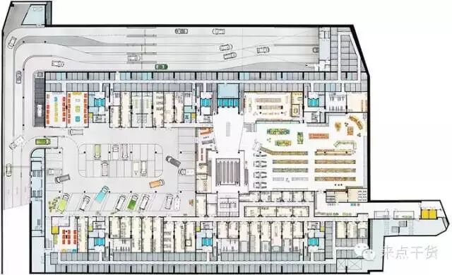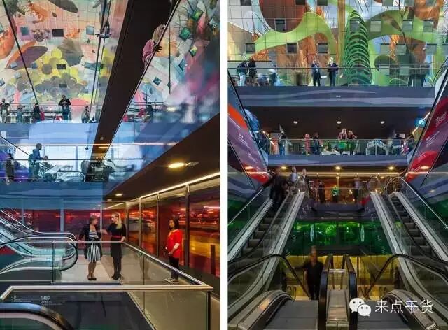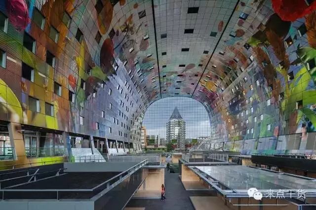 1、拱形独特造型是菜市场成为景观地标的因素之一,况且,中庭尺度为120m x 70m x 40m,这个尺度能给人带来独特的体验,虽然容积率大大拉低,但是体验性升高了百倍。并且,顶部的巨型壁画配合丰富的业态也给体验增添了浓厚的乐趣。