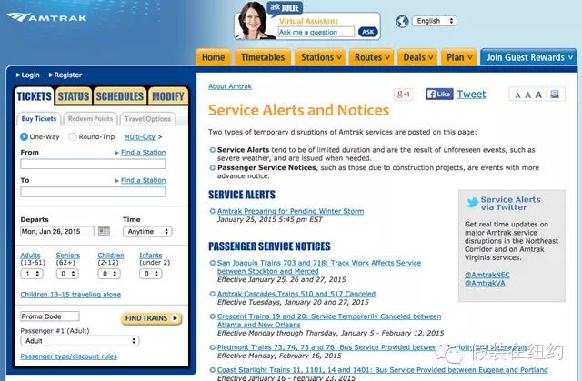 这是美国国家铁路公司Amtrak的网站,上面同样可以快速地查到各项信息。其他铁路系统的类似信息也都可以在各自网站上找到。