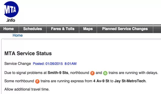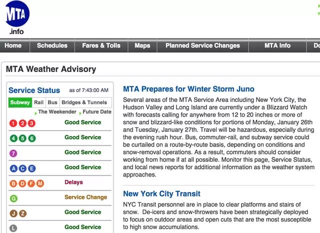 假设你是一个纽约市民,早上起来看到暴风雪,想知道自己上班坐的地铁和公交车是不是还在正常运行,那么你可以点开交通管理部门“大都会运输署”的网站。这个网站略显简陋,但是在首页一眼就能看到地铁、公交车、铁路、桥梁和隧道的运行状况。