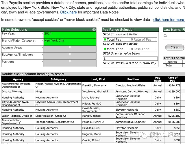 毫不夸张地说,在美国这个国家,所有的信息都是透明的。普通人想查询任何公共事务方面的数据,都可以非常方便地查到。比如政府部门每一个工作人员每一年的薪酬状况。在下面这个网站上,我查到了房屋局的电梯维修工Luis Cevallos的日薪是350美元,而劳动关系处处长James Hanley在2014年的年薪则是205180美元。