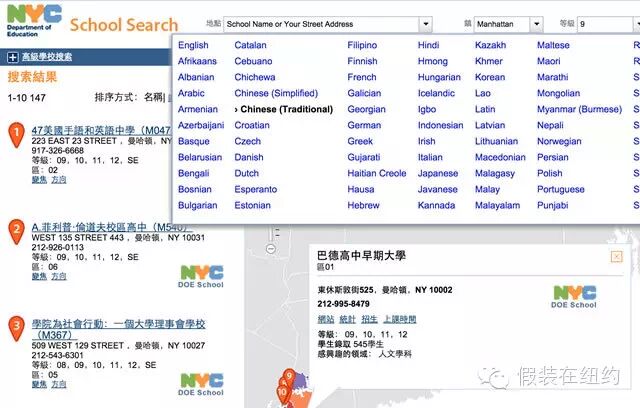 查完警察局,我们再来看看教育局(Department of Education, 简称DOE)的情况。不出意外地,教育局的网站上可以方便地查到所有的学校,并且可以根据地址、区域、年级等多个条件进行检索,而且还提供了91种语言的翻译(这个也是没办法,纽约就是有这么多种族和国家的人啊)。