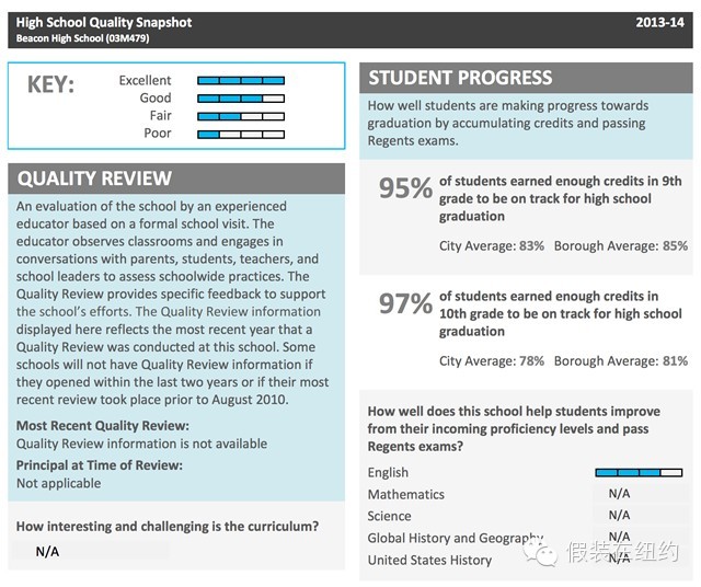 我们点开其中的一所学校,灯塔高中(Beacon High School)的页面,上面除了各种基本信息、介绍和联系方式以外,最重要的,仍然是一份PDF文档,上面详细载明了这个学校在上一学年的各项统计数据,非常详尽。比如灯塔高中的统计报告上就可以看到,该校上一学年95%的9年级学生成绩合格,而同期全市的平均合格率是83%,该校所在的布鲁克林区的平均合格率则是85%。当然,每一所学校都一定会有这样一份统计数据。可想而知对于学生家长来说,这些数据是多么重要。