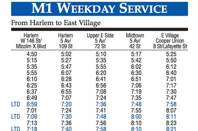 当然,这个网站提供的不止是延误信息,你还可以在上面查到每一班地铁和每一路公交车每天到达每一个站的时间。比如,下面就是M1路公交车的运行时刻表。