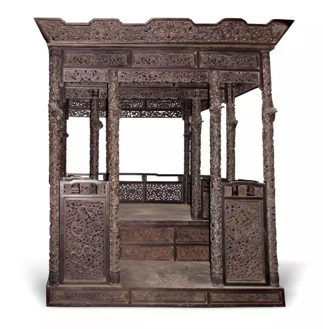 它造型奇特,体积庞大,结构复杂,好像把架子床安放在一个木制平台上,平台前沿长出床的前沿二三尺。平台四角立柱,镶以木制围栏。还有的在两边安上窗户,使床前形成一个回廊,回廊中间置一脚踏,两侧可以放置小桌凳、灯盏等。