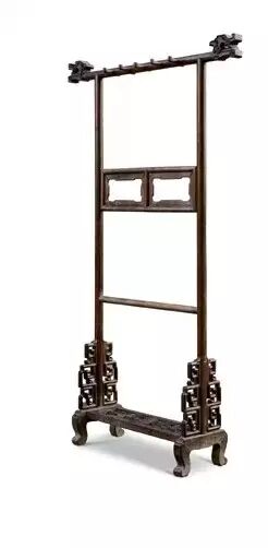 古人衣架,包括清代衣架,多采用横杆形式,两侧有立柱,上下承木墩底座,两座之间有横板或横枨,立柱顶端安横梁,两端长出立柱,尽端雕出龙凤纹或灵芝或云头之类。横杆之下安中牌子,上有透雕装饰,主要起牢固作用。衣服脱下后就搭在横杆之上。
