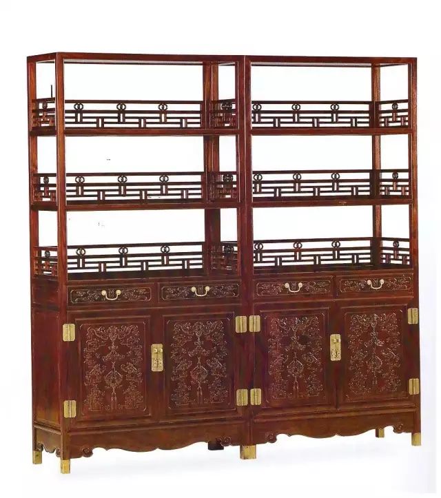 至于用横、竖板将空间分隔成若干高低不等、大小有别的格子则是在清雍正时期开始流行的形式,这种格内屉板高低错落,俗称“博古架”或“百宝格”,专用来陈放文玩古器,放在书房、客厅雅致非常,有浓厚的清式家具风格。
