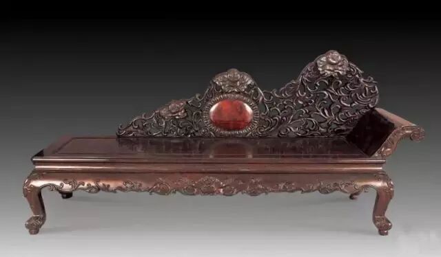 有的贵妃榻为单翘头、尾部上卷设计,瑞草卷珠外翻球式直腿,透雕牙条采用拐子纹卷草图案,围栏的二龙戏珠穿云喷水透雕图案最为醒目,它鲜明体现了清式家具的恢宏气派。