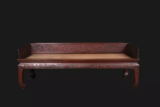 明清时期的贵妃榻,展现出精细打磨的技法,体现在对围栏、扶手、榻腿的雕花儿上,龙纹透雕最为流行,大概是源自中华民族对龙图腾的膜拜上;贵妃榻对于榻腿、牙板的细节设计更是精益求精,无论是直腿、弯腿都少不了细琢的花草图案,榻体多为平板和按摩板,体型较之欧美贵妃榻更硕大,展现着皇室的风范和皇权的威严。