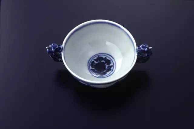 这是个极美的建窑窑变釉天目盏,上面出现的蓝色釉点如满天幻彩,在灯光下还发出微微的红光。