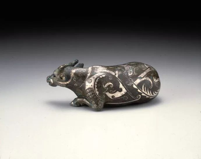 这对铜牛的纹饰也是片状镶嵌,这类器物国内极为少见。