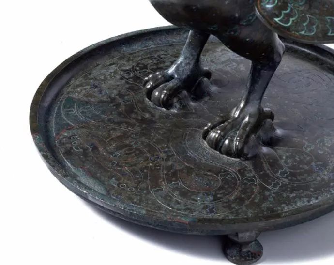 这是一个器物的盖子,如果整器还在那,该是何等的精美。上面的纹饰应该是一条神龙,然见其尾,不见其首。中国有一句成语叫神龙见首不见尾,其实周易八卦中的说的是:见群龙无首。所以这个盖子的纹饰也反映了一种哲理。