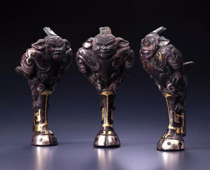 或汉早期嵌金铜质独牛腿人首酒器三具,