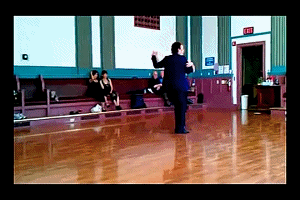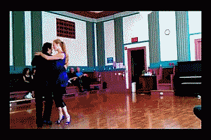 此动作为:由Ocho Adelante(前向的8字步)进入,由引带者向后的Sacada( 置换)+ 侧步Sacada( 置换)+ 跟随者的Gancho(勾腿),再由Ocho Adelante(前向的8字步)解出的一个组合小套路。