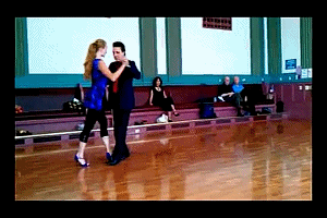 此动作为:由跟随者超大拧转的Ocho Adelante(前向的8字步)【即:前ocho向后走】进入,引带者做向前行进的Sacada( 置换)的一个组合小套路。
