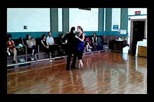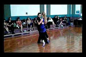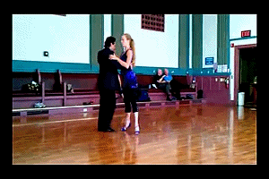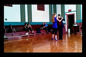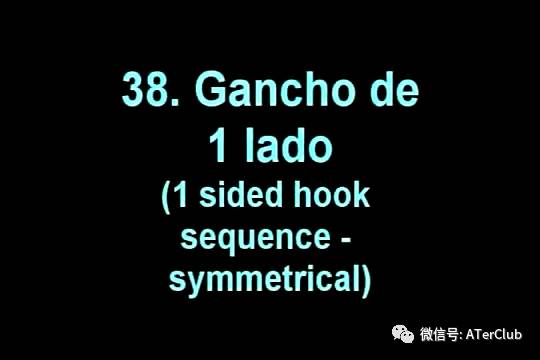 此动作为:跟随者从两侧做的行进中的Gancho(勾腿)的一个组合小套路。
